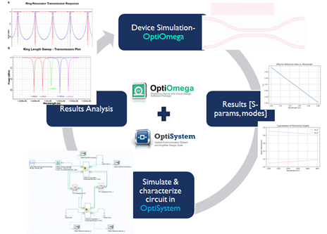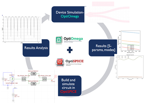 OptiOmega allows the software interworking internally with other Optiwave simulation tools such as: OptiSPICE and OptiSystem. OptiSPICE is a SPICE engine based electro-optic circuit simulator that allows to simulate chip level circuits in both frequency and time-domain. OptiSystem aids in building and characterizing the device/PIC performance at a system level. The photonic devices are simulated using OptiOmega and the generated results in the form of S-parameters (touchstone format) and modal data (neff and ng) are used to build the PICs or system level circuits inside OptiSPICE/OptiSystem. The frequency or time domain simulations are carried out for the circuits that helps in validating the device performance.