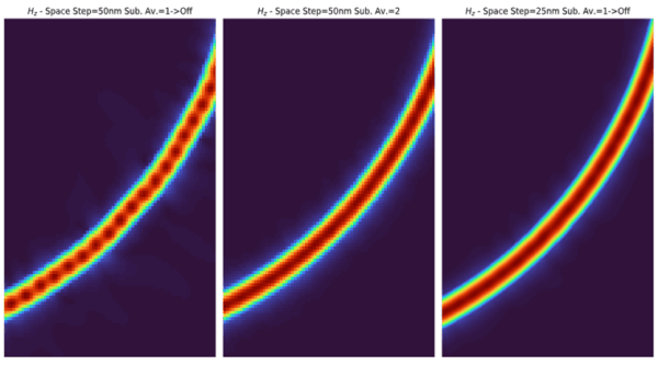 • It has sub-pixel averaging feature that allows better description of the material distribution, by reducing the stair-casing of the permittivity profile and minimizing unwanted reflections. Sub-pixel averaging when turned ON, allows to achieve precise and accurate results even with coarse mesh settings, thereby reducing computational time.
